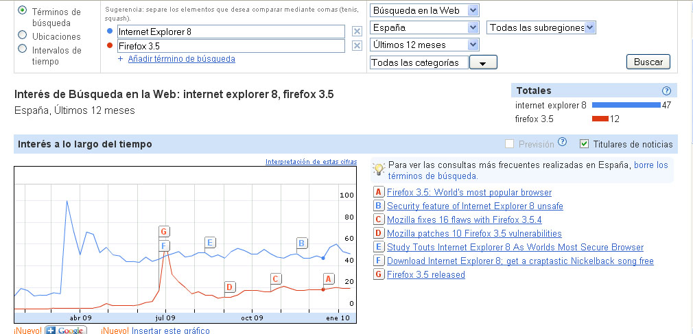 Estos últimos meses hemos asistido al lanzamiento de las dos nuevas versiones de los navegadores más utilizados mundialmente: Firefox 3.5 y Explorer 8. A través de Google Insight podemos comprobar como Firefox se está acercando peligrosamente al navegador del gigante Microsoft. Aquí os dejo unos pantallazos: